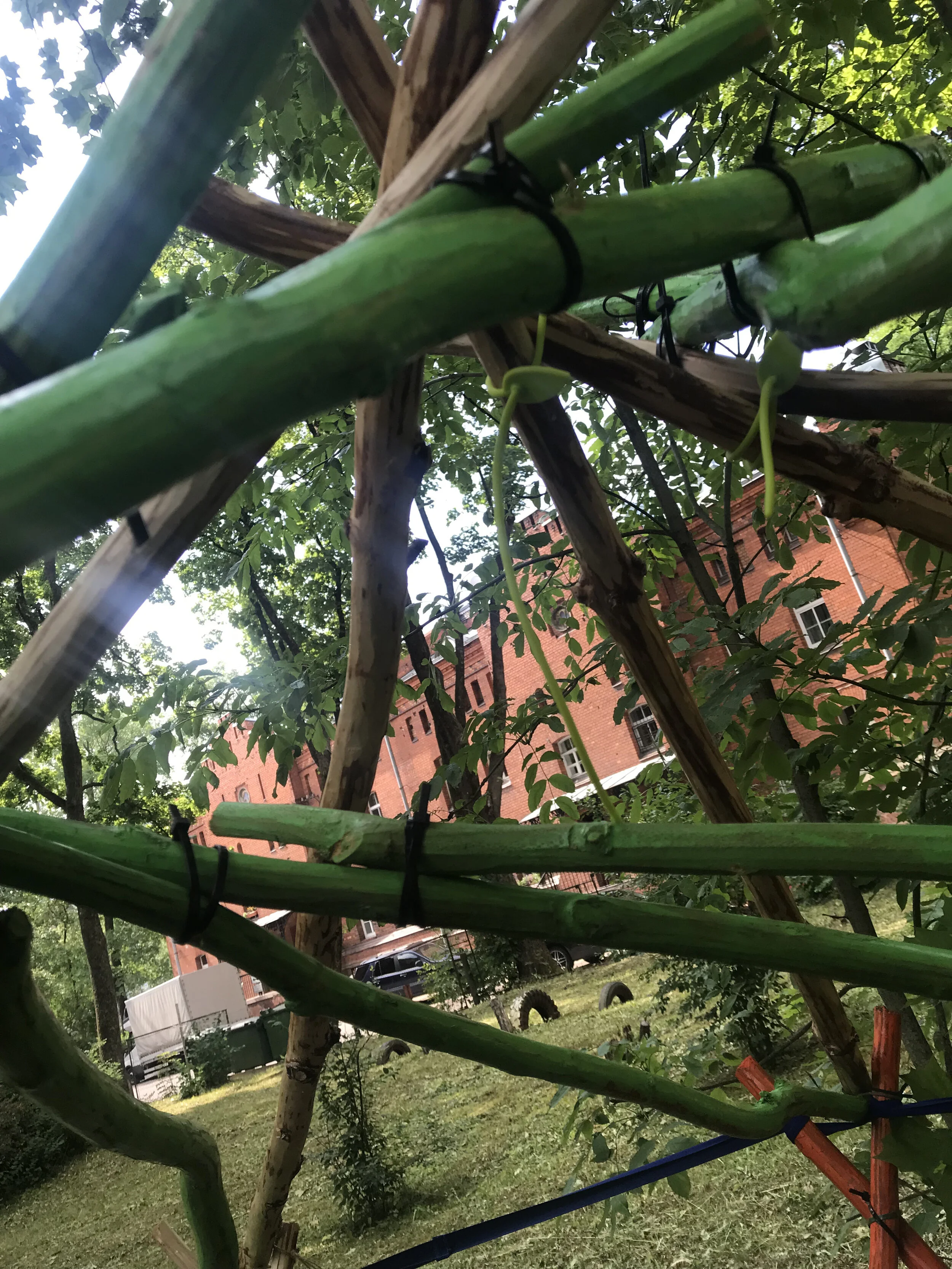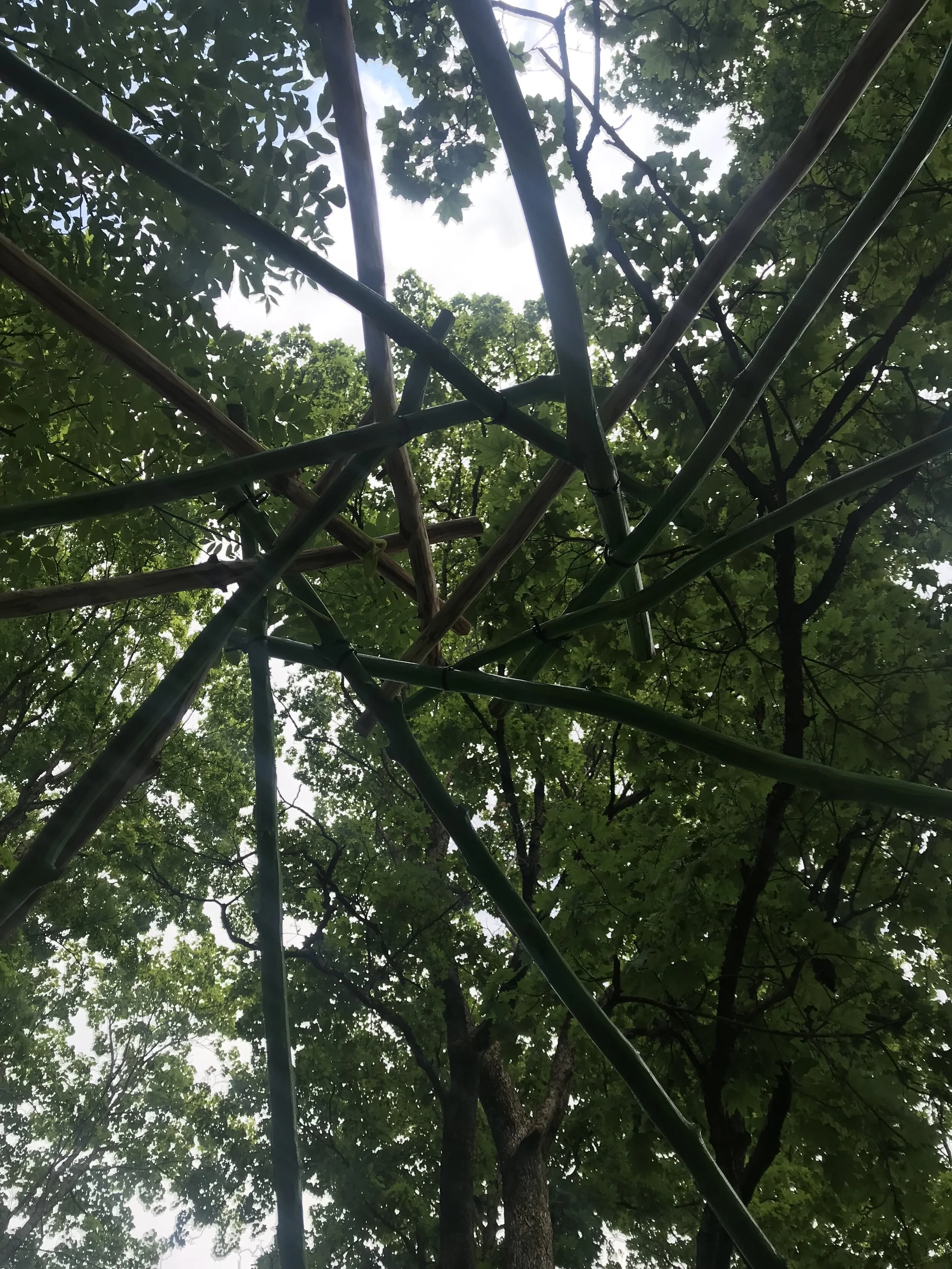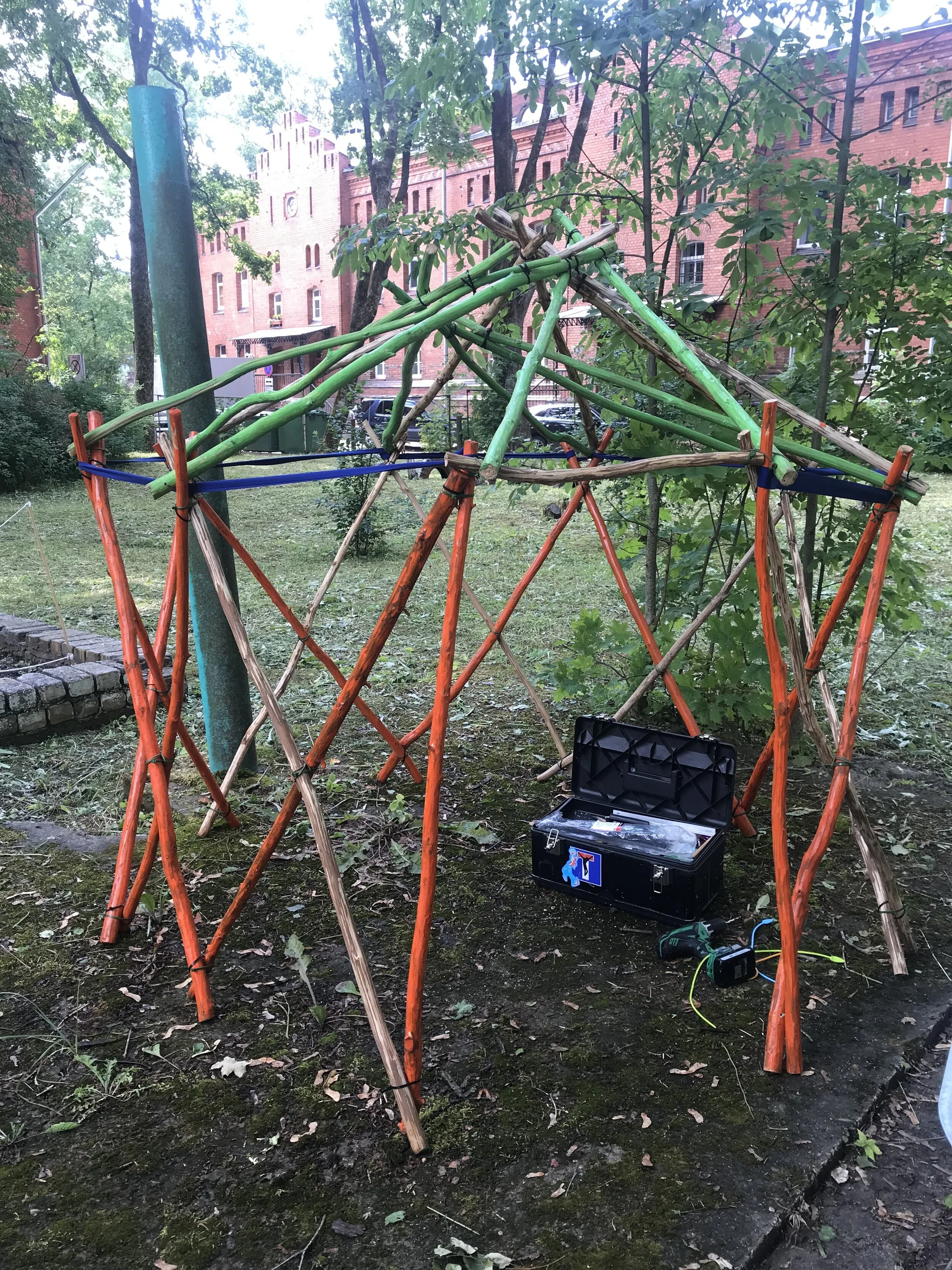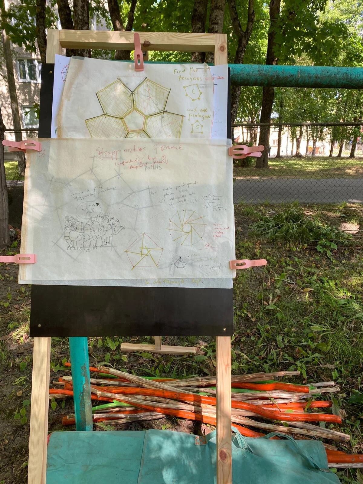 Self-supporting frame (also Reciprocal architecture) is known to be based on complex calculations and well as popular in natural building. I wanted to try it for myself if I could simplify it and together at the workshops we could make a small yurt based on these principals.