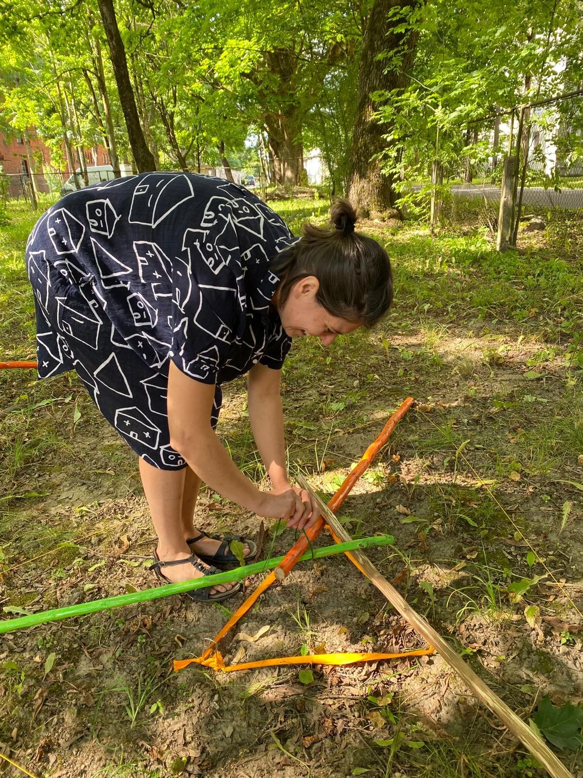 Calculations and miniature model building was done long before at the art residency Massia in spring 2021, but idea born even earlier when I was working as seamstress for Glen: master yurt maker in Manchester, UK and he retired, but I wanted to continue yurt-making. I am in no way professional woodworker, but a cover maker for outdoor structures, however I was keen to learn simple constructions of frames which can be used for outdoor structure (nomadic building) and believed that anyone can do it: understand basic physics for constructing a yurt, and maybe even make one with just tying sticks together, so I set out to to this experiment together with participants of workshops in Narva.