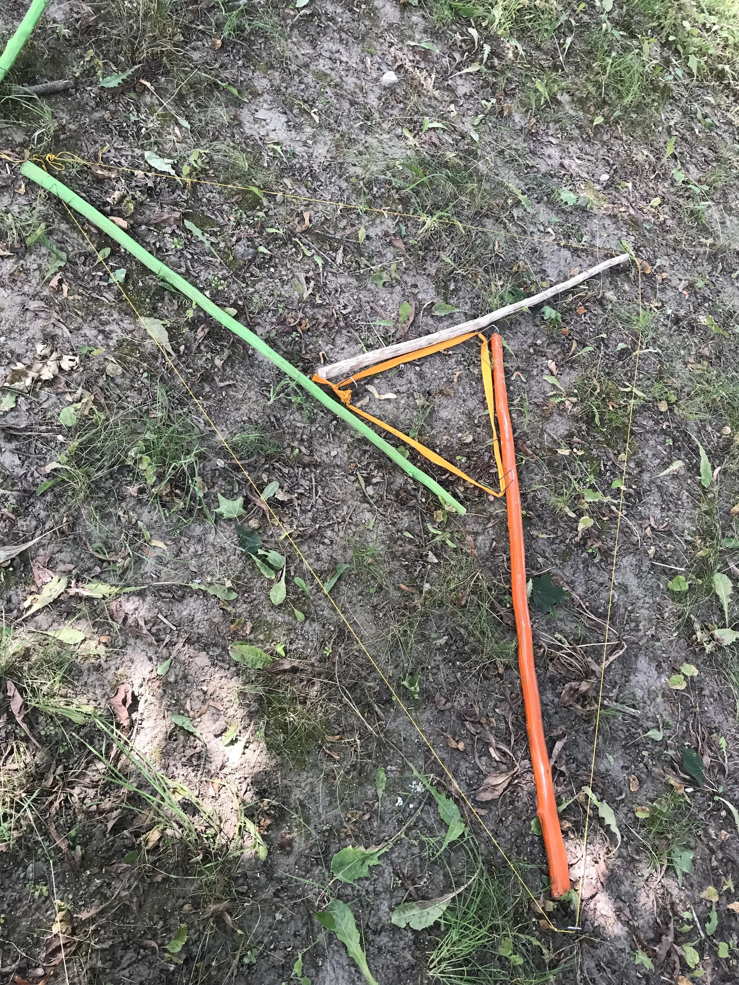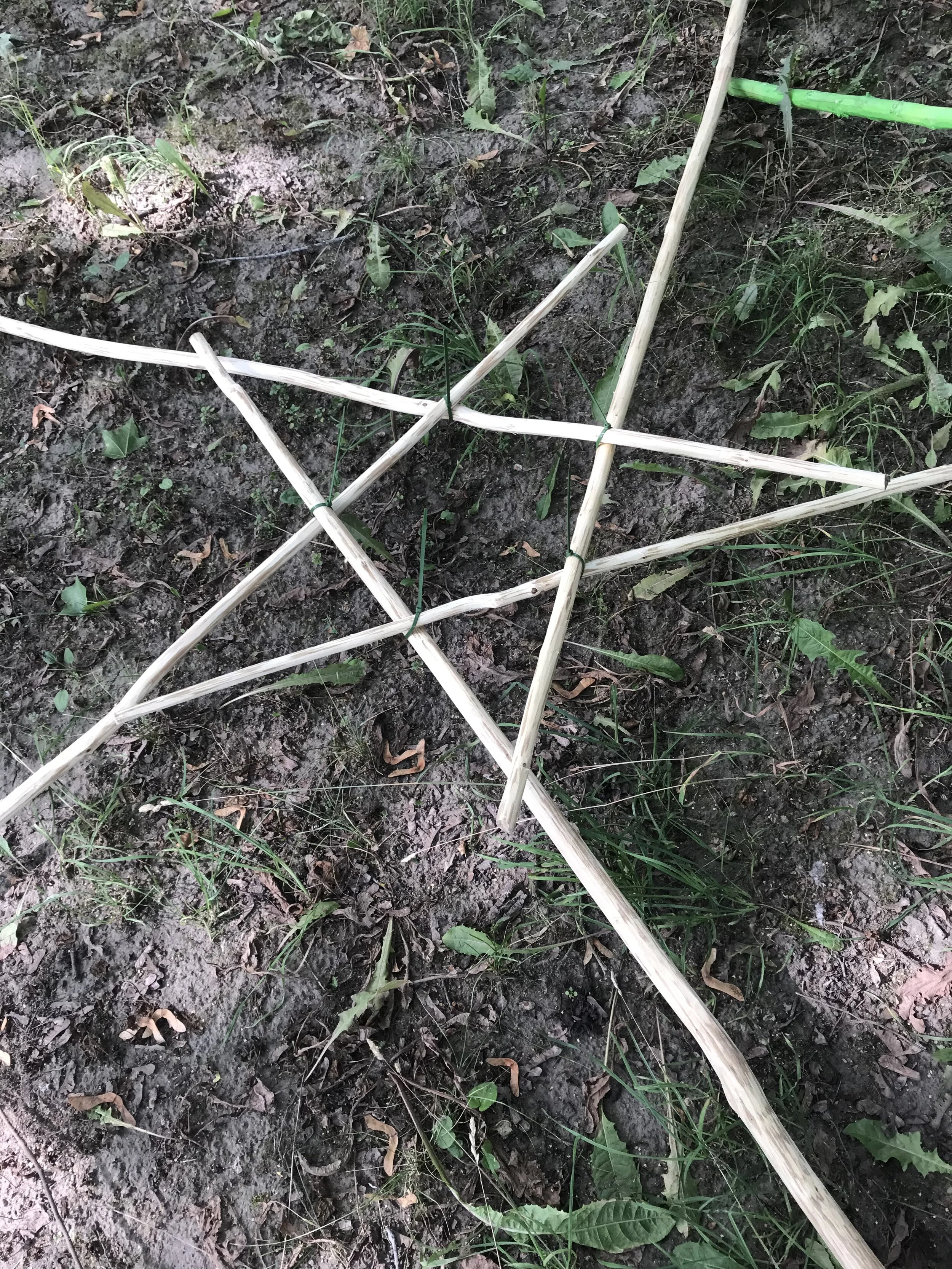 Then using understanding of a self-supporting frame we attempted to create a yurt frame just with tying sticks to one another. We made a concertina wall first then on the ground put together a reciprocal roof from 8 rods, which we lifted up onto walls, making a primitive yurt: