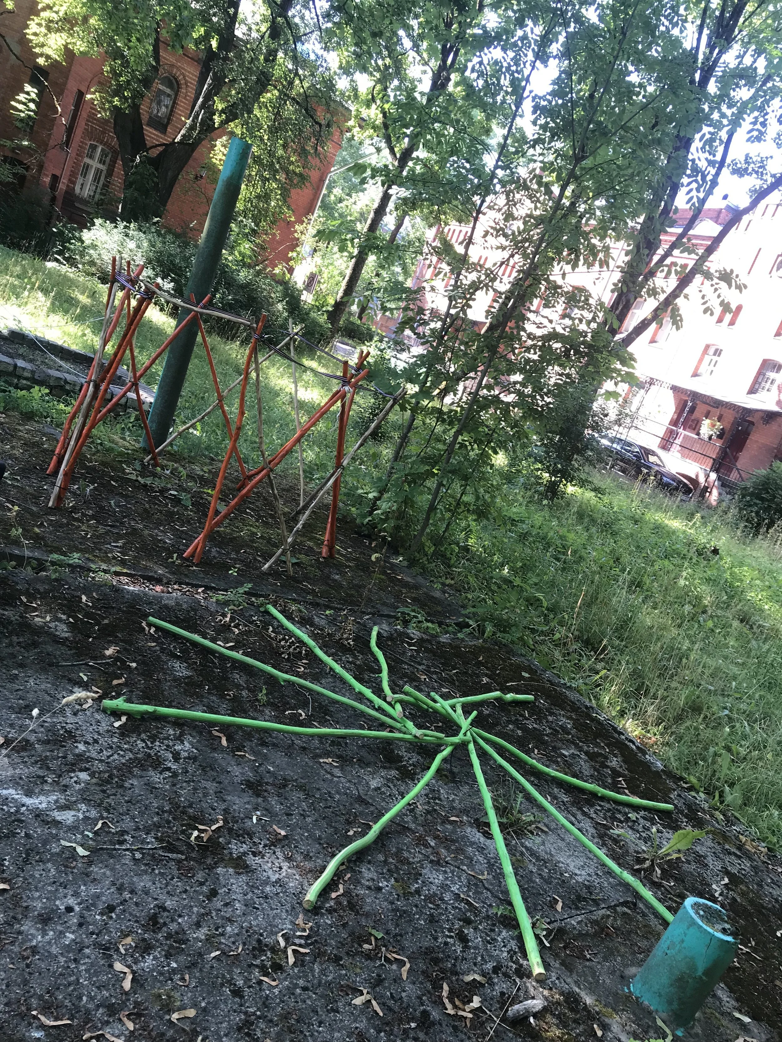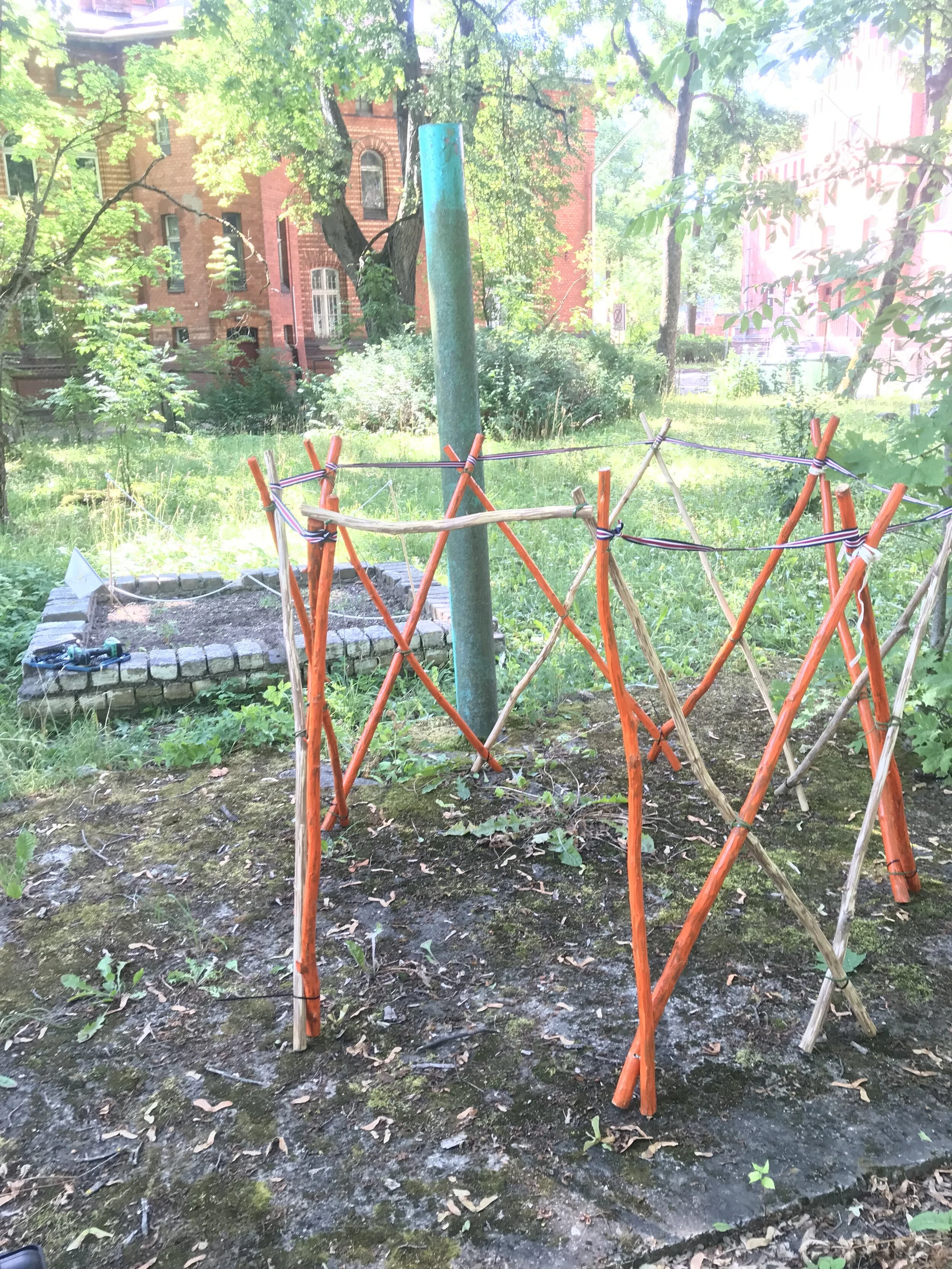 On the second day of the workshop: recalculations had to be made as yurt’s roof turned out to be quite flat on the first attempt. So it was taken off and reconstructed with a higher pith with people from nearby Narva Sotsiaaltöökeskus Maslovi3 (Social-help day centre working with neurodiverse clients). At the end it turned out to be success; we constructed a small yurt using zip-ties and a reciprocal roof for it: where each stick supports other in the circle. This was a fun activity to make a most primitive yurt with no tools just ties.